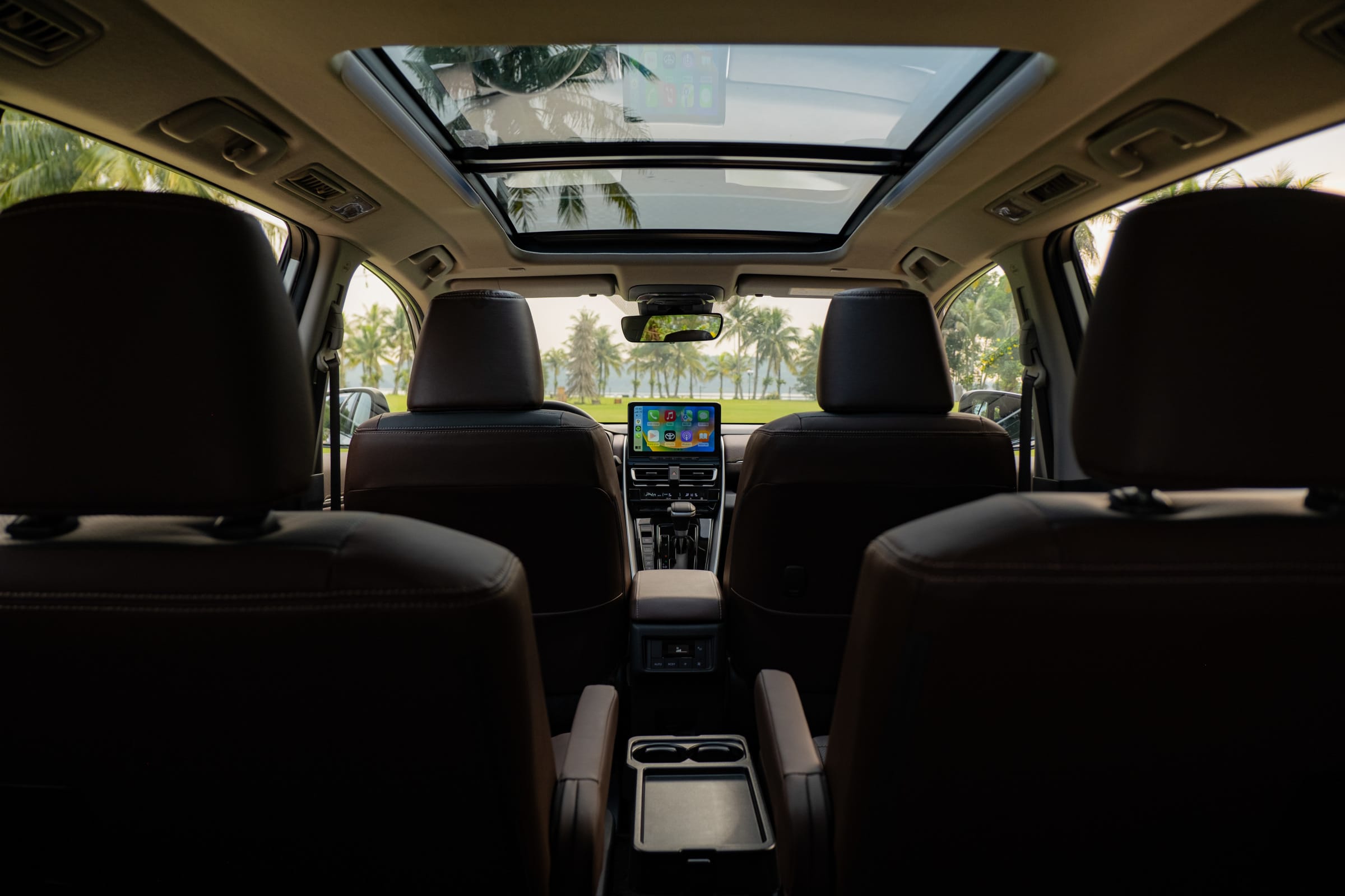 Innova Cross V có cấu hình 8 chỗ (3 hàng ghế: 2-3-3), trong khi bản HEV có 7 chỗ với ghế thương gia hàng 2. Chiều dài cơ sở 2,850mm — dài nhất phân khúc MPV hạng C — kết hợp sàn phẳng nhờ dẫn động cầu trước tạo không gian để chân thoải mái cho cả 3 hàng ghế. Trang bị tiện nghi đáng chú ý:- Màn hình giải trí 10.1 inch hỗ trợ Apple CarPlay/Android Auto không dây.
